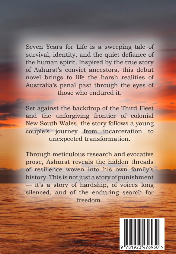 Seven Years for Life is a sweeping tale of survival, identity, and the quiet defiance of the human spirit. Inspired bt the true story of Ashurst's convict ancestors, this debut novel brings to life harsh realities of Australia's penal past through the eyes of those who endured it.
