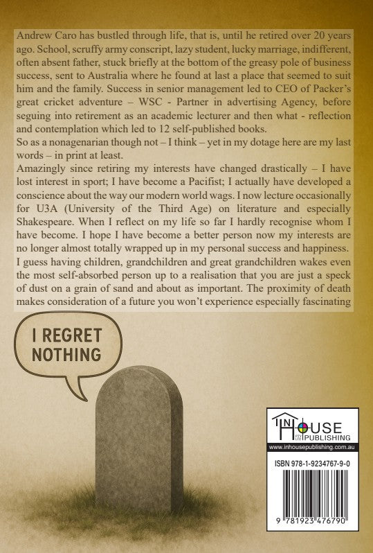 Andrew Caro has bustled through life, that is, until he retired over 20 years ago. School, scruffy army conscript, lazy student, lucky marriage, indifferent, often absent father, stuck briefly at the bottom of the greasy pole of business success, sent to Australia where he found at last a place that seemed to suit him and the family. Success in senior management led to CEO of Packer’s great cricket adventure – WSC - Partner in advertising Agency, before seguing into retirement as an academic lecturer and then what - reflection and contemplation which led to 12 self-published books. So as a nonagenarian though not – I think – yet in my dotage here are my last words – in print at least. When I reflect on my life so far I hardly recognise whom I have become. The proximity of death makes consideration of a future you won’t experience especially fascinating